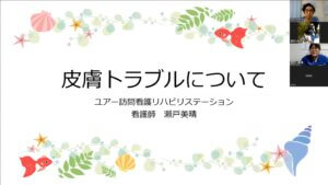 テーマは【在宅に多い皮膚トラブルとその対処法について】ということで、今回のプレゼンターはユアー訪問看護ステーション瀬戸よりお送りいたしました。